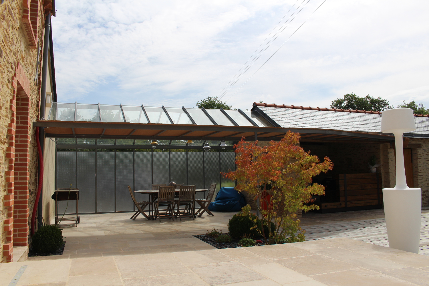 La conception d’un bar unique par les artisans locaux puis la création d’une verrière entre les bâtiments permet une ambiance chaleureuse et confinée pour ces extérieurs. De nuit, le paysage s’éclaire et permet un univers très lumineux.