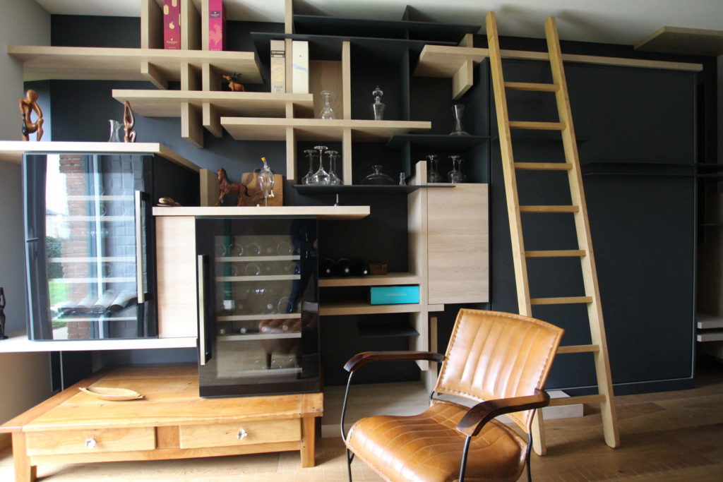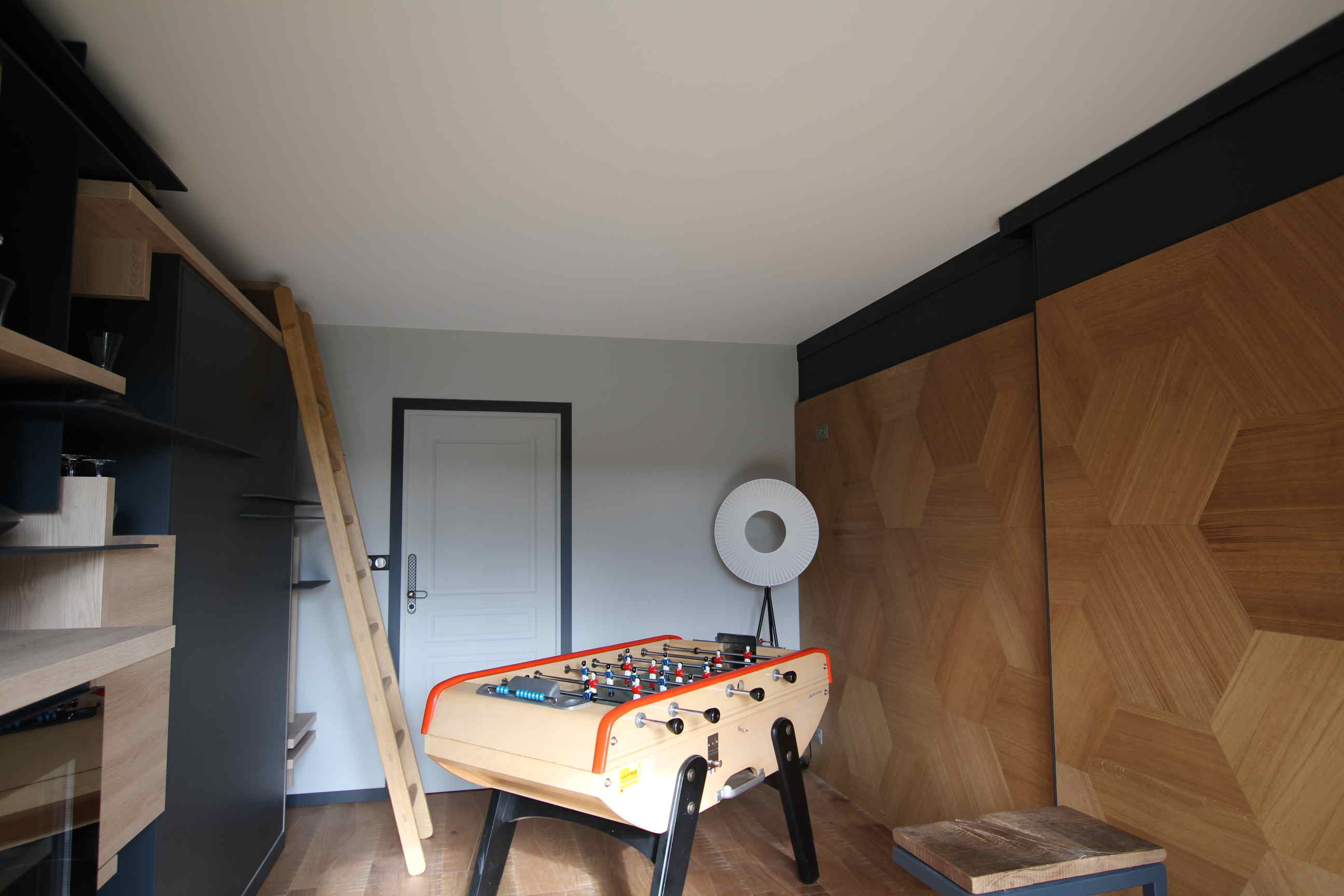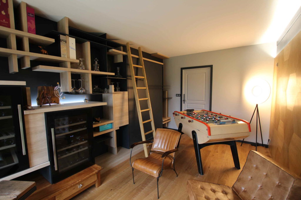 Cette pièce sans unité particulière a été réaménagée en une cave / chambre d’amis. Cette suite boudoir est le fruit d’une réflexion autour de produits d’excellences telle que la suspension Mozaik de chez Design Heure.